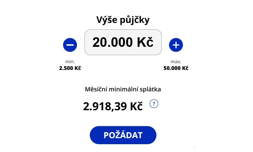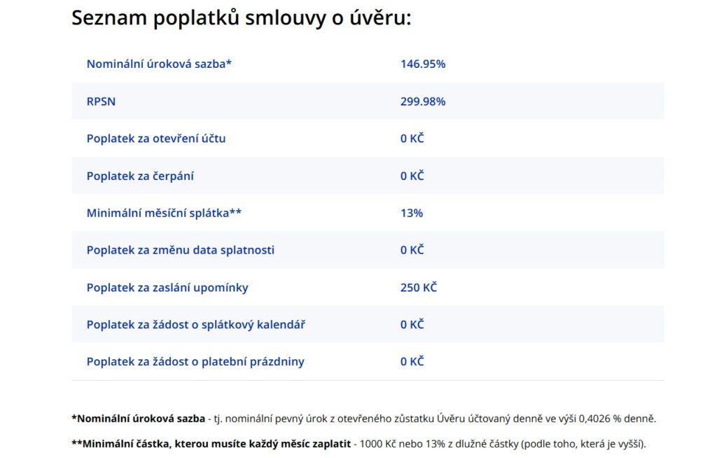 Reprezentativní příklad – úvěr ve výši 20 000 Kč je čerpán okamžitě v plné výši a splácen ve 12 stejných měsíčních splátkách ve výši 2 993,29 Kč. Doba trvání úvěru: na dobu neurčitou. Pevná roční úroková sazba činí 146,95 %. RPSN činí 299,98 % a celková částka je 35 919,48 Kč.
